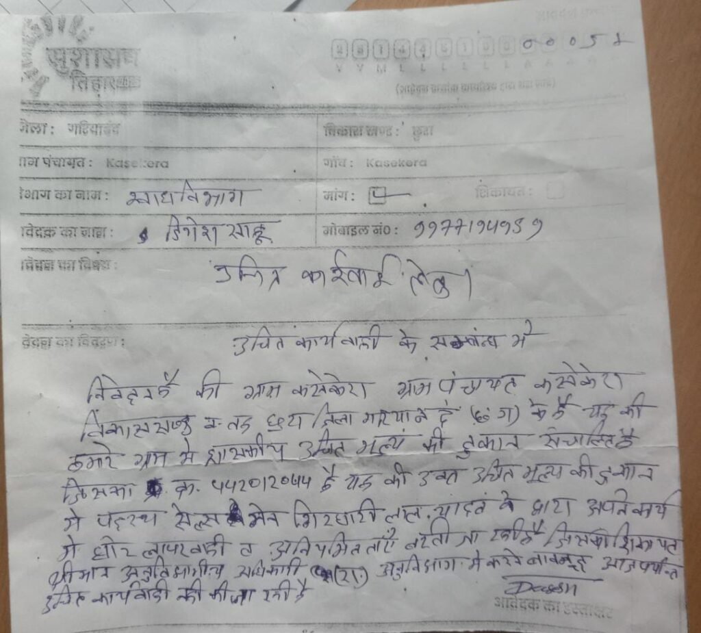 छुरा/विकासखंड छुरा में वैसे तो कई कारनामे होते हैं पर मरे हुए व्यक्तियों के नाम से राशन खाने वाले सेल्समैन आपको पूरे विकास खंड के कई ग्राम पंचायत में देखने को मिलेगा ।पर जिनके खिलाफ शिकायत हो उसके 3 साल बाद भी अब तक कार्यवाही नहीं हुई है मामला ग्राम पंचायत कर सके रखे सेल्समैन गिरधारी यादव से जुड़ा हुआ है जिसकी शिकायत ग्राम पंचायत कसक के रखे 16 मृत्यु परिवार के सदस्यों ने खाद्य विभाग कलेक्टर एसडीएम तहसीलदार अनुभागी मुख्य कार्यपालन अधिकारी सब के पास के थी पर आज तक कोई कार्रवाई नहीं है