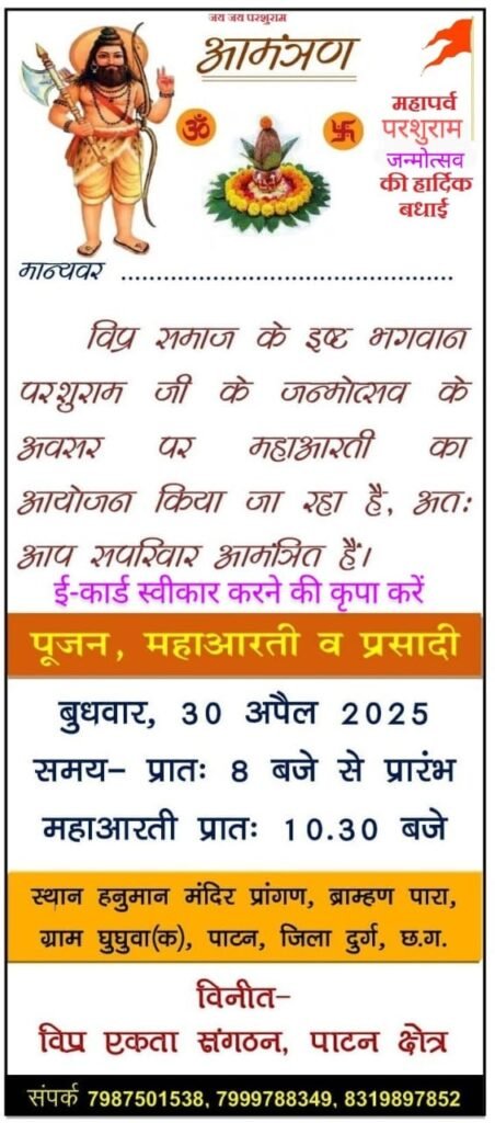 पाटन। हर साल वैशाख मास के शुक्ल पक्ष की तृतीया तिथि को भगवान विष्णु के छठे अवतार, परशुराम जी की जन्मोत्सव मनाई जाती है, इस वर्ष शुभ अवसर पर विप्र समाज के इष्ट भगवान परशुराम का जन्मोत्सव पाटन क्षेत्र के समीपस्थ ग्राम के स्थानीय विप्र समाज द्वारा ग्राम नारायणपुर(घुघुवा क) में बुधवार 30 अप्रैल को परशुराम जन्मोत्सव मनाया जायेगा। पूजन का कार्यक्रम प्रातः 8 बजे से प्रारंभ होगा एवं महाआरती प्रातः 10.30 बजे होना है, प्रसाद वितरण 11 बजे होगा। ई-कार्ड के माध्यम से सभी आमंत्रित किया गया है, जिस किसी सज्जन को ई आमंत्रण पत्र प्राप्त नहीं हुआ है, वे सभी इस समाचार को ही आमंत्रण के रूप में स्वीकार कर अपनी पावन उपस्थिति प्रदान करने की कृपा करें, सभी की उपस्थिति प्रार्थनीय है। उक्त जानकारी प्रशांत शर्मा ने दी है।