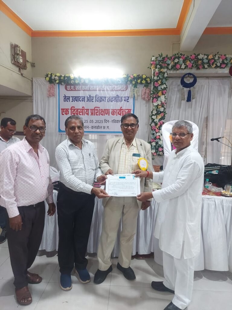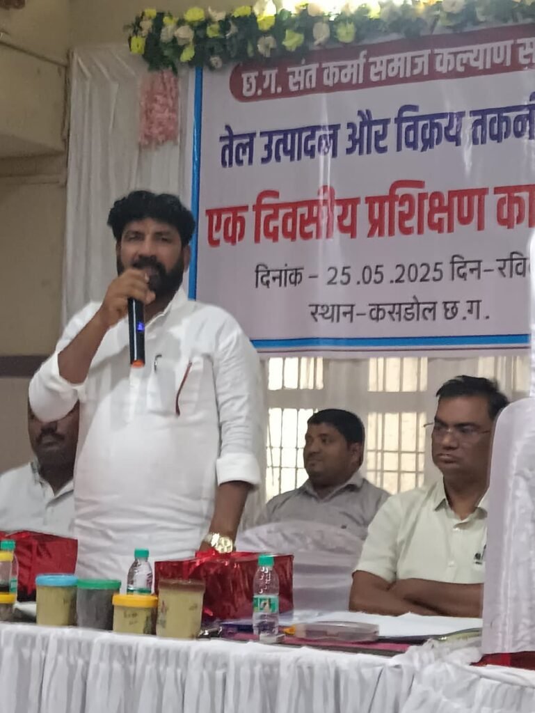 कसडोल। छ ग संत कर्मा समाज कल्याण समिति के तत्वावधान मे एक दिवसीय प्रशिक्षण कार्यक्रम, तेल उत्पादन और विक्रय तकनीक रविवार को आयोजित किया गया। कार्यक्रम के मुख्य अतिथि जितेंद्र साहू तेलघानी बोर्ड अध्यक्ष थे।