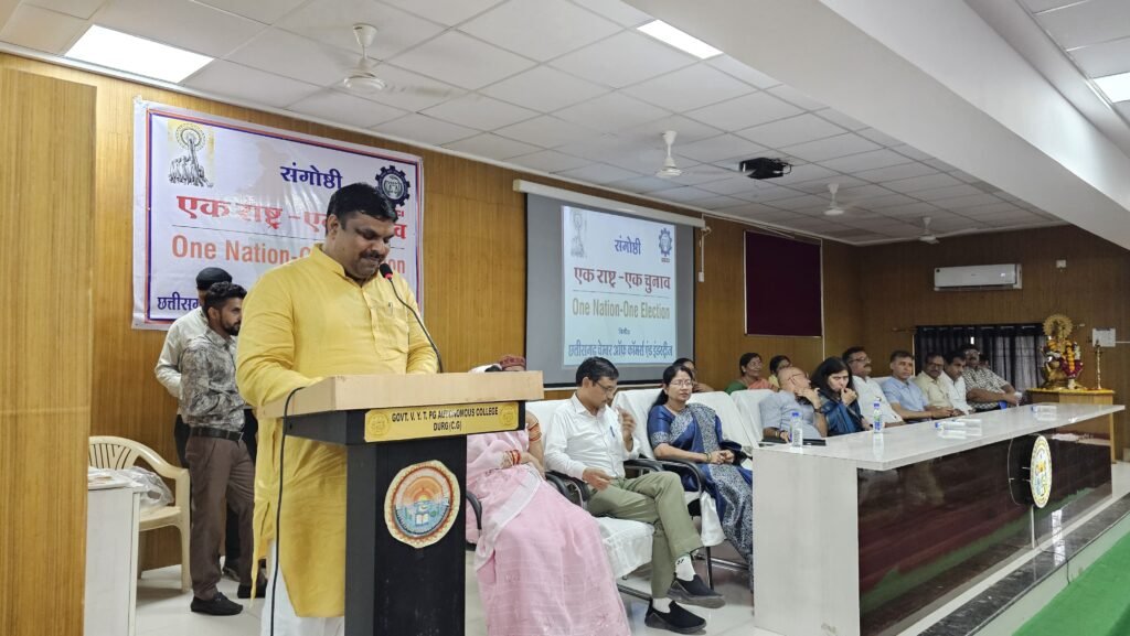 दुर्ग। भारत को विकसित राष्ट्र बनाने में एक राष्ट्र एक चुनाव को लेकर आज दुर्ग शहर विधानसभा स्तरीय संगोष्ठी आयोजित हुई। छत्तीसगढ़ चेम्बर ऑफ कॉमर्स एंड इंडस्ट्रीस के तत्वाधान में आयोजित कार्यक्रम के मुख्य अतिथि भाजपा की राष्ट्रीय उपाध्यक्ष सुश्री सरोज पाण्डेय रही जिन्होंने देश के विकास में एक राष्ट्र एक चुनाव पर उपस्थितजन को सम्बोधित कर समर्थन करने अपील किये। उन्होंने आचार संहिता में चुनाव आयोग की गतिविधियों में होने वाले खर्च और प्रशासनिक कार्य की रुकावट की जानकारी देते हुए पूरे देश में एक साथ चुनाव कराने से जनता को होने लाभ की जानकारी साझा किये। विधायक गजेन्द्र यादव ने एक राष्ट्र एक चुनाव का समर्थन करते हुए कहा कि एक चुनाव की दिशा में देश को आगे बढ़ना चाहिए। उन्होंने कहा कि देश में बार-बार होने वाले चुनावों से विकास कार्य रुकते हैं, जबकि एक साथ चुनाव होने से विकास की गति तेज होगी और जनता के हित में बेहतर निर्णय लिए जा सकेंगे। विधायक गजेन्द्र यादव ने अपील की है कि वे दलगत राजनीति से ऊपर उठते हुए ‘एक राष्ट्र एक चुनाव’ का समर्थन करें। संगोष्ठी के मुख्य वक्ता रहे डॉ. शकील हुसैन ने एक राष्ट्र एक चुनाव के महत्व और तकनीकी जानकारी को लेकर विस्तृत जानकारी उपस्थितजन को साझा किये। उन्होंने कहा चुनाव के दौरान आचार संहिता लगने के दौरान विकासकार्य प्रभावित होते हैं। एक चुनाव की आचार संहिता कई महीने चलती है। इस दौरान चुनाव के निर्देश पर पूरा प्रशासनिक अमला और सुरक्षाकर्मी व्यस्त रहते है। बार बार होने वाले चुनाव में शासन का हजारों करोड़ खर्च होते है, देश में एक साथ चुनाव होने सरकार का समय और करोड़ों की राशि की बचत होगी जिसे देश के विकास में लगाया जा सकेगा। इस अवसर पर जिलाध्यक्ष सुरेंद्र कौशिक, महापौर अलका बाघमार, सभापति श्याम शर्मा, चेम्बर के प्रदेश महामंत्री अजय भसीन, जिला संयोजक राजेन्द्र पाध्ये, पूर्व मंत्री रामशीला साहू, पूर्व महापौर चन्द्रिका चंद्राकर, पूर्व अध्यक्ष उषा टावरी, दीपक चोपड़ा, अशोक राठी, मंडल अध्यक्ष, महिला मोर्चा, युवा मोर्चा सहित जिला भाजपा के पदाधिकारी और कार्यकर्त्तागण उपस्थित रहे।