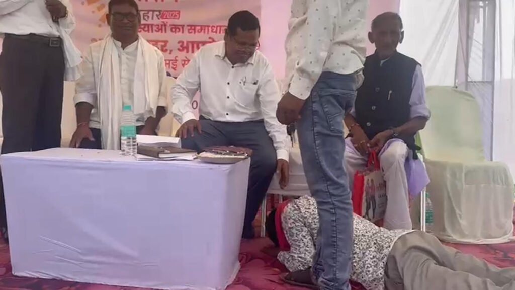 गरियाबंद। सिस्टम के आगे सब बेबस हैं, फिर किसान क्या चीज है. इसका एक नजारा मंगलवार को देवभोग विकासखंड में निष्ठीगुड़ा में आयोजित अंतिम समाधान शिविर में देखने को मिला, जहां किसान मंच पर मौजूद एसडीएम के सामने साष्टांग हो गया। किसान सिर्फ एक बात ही बात कह रहा था कि साहब! बंटवारा करा दो।