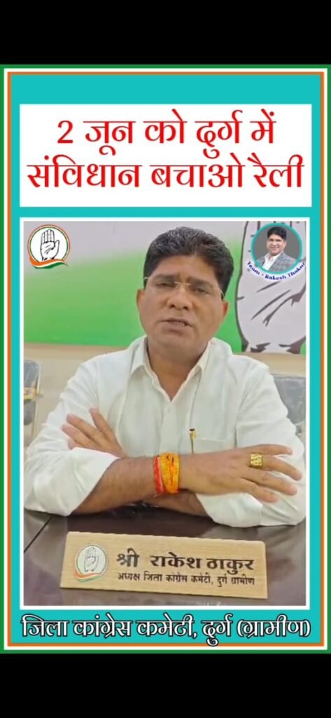पूर्व मुख्यमंत्री भूपेश बघेल जी की अगवाई में और जिले के समस्त वरिष्ठ नेता का जनप्रतिनिधि की उपस्थिति में दुर्ग ग्रामीण, दुर्ग शहर, भिलाई कांग्रेस के संयुक्त तत्वाधान में होने वाली संविधान बचाओ रैली की तैयारी जिला ग्रामीण कांग्रेस अध्यक्ष राकेश ठाकुर , दुर्ग शहर अध्यक्ष गया पटेल, भिलाई जिला कांग्रेस अध्यक्ष मुकेश चंद्राकर के नेतृत्व में की जा रही है । जिला ग्रामीण कांग्रेस अध्यक्ष राकेश ठाकुर ने जानकारी दी कि 11 बजे पूर्व मुख्यमंत्री भूपेश बघेल सहित वरिष्ठ नेता गण राजीव भवन में एक सभा की जाएगी सभा के बाद सभी कांग्रेसी रैली के रूप में पदयात्रा करते हुए राजीव भवन से पांच कंडील गांधी चौक, मोती कॉम्प्लेक्स, पुराना बस स्टैंड होकर महात्मा गांधी जी की प्रतिमा हिंदी भवन के सामने प्रतिमा में माल्यार्पण कर रैली का समापन किया जाएगा । रैली में दुर्ग जिले की सभी विधानसभा के साथ साजा विधानसभा के नेतागण व कार्यकर्ता शामिल होंगे