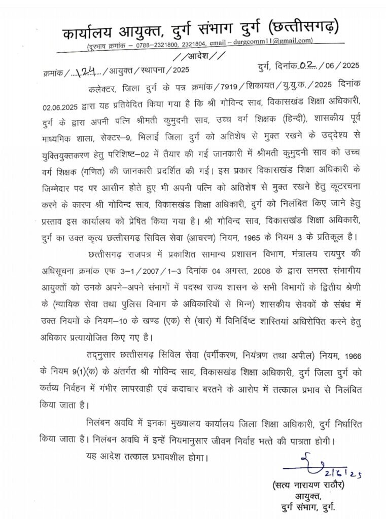 दुर्ग/ दुर्ग संभाग के आयुक्त सत्यनारायण राठौर ने कलेक्टर दुर्ग के प्रतिवेदन के आधार पर विकासखण्ड शिक्षा अधिकारी दुर्ग गोविंद साव को शिक्षकों के युक्तियुक्तकरण अंतर्गत अपनी पत्नी को अतिशेष से मुक्त रखने परिशिष्ट-02 में तैयार की गई जानकारी को कर्त्तव्य निर्वहन में गंभीर लापरवाही एवं कदाचार बरतने के आरोप में छत्तीसगढ़ सिविल सेवा (वर्गीकृत, नियंत्रण तथा अपील) नियम 1966 के नियम 9 (1) (क) के अंतर्गत तत्काल प्रभाव से निलंबित किया है। निलंबन अवधि में श्री साव का मुख्यालय कार्यालय जिला शिक्षा अधिकारी दुर्ग निर्धारित किया गया है। साथ ही इस अवधि में उन्हें नियमानुसार जीवन निर्वह भत्ते की पात्रता होगी। ज्ञात हो कि गोविंद साव विकासखण्ड शिक्षा अधिकारी दुर्ग के द्वारा अपनी पत्नी श्रीमती कुमुदनी साव उच्च वर्ग शिक्षक (हिन्दी) शासकीय पूर्व माध्यमिक शाला सेक्टर-09 भिलाई जिला दुर्ग को अतिशेष से मुक्त रखने के उद्देश्य से युक्तियुक्तकरण हेतु परिशिष्ट-02 में तैयार की गई जानकारी में श्रीमती कुमुदनी साव को उच्च वर्ग शिक्षक (गणित)की जानकारी प्रदर्शित की गई। इस प्रकार विकाखण्ड शिक्षा अधिकारी के जिम्मेदार पद पर आसीन होते हुए अपनी पत्नी को अतिशेष से मुक्त रखने हेतु कुटरचना की गई। श्री साव का उक्त कृत्य छत्तीसगढ़ सिविल सेवा (आचरण) नियम-1965 के नियम 03 के प्रतिकूल है।