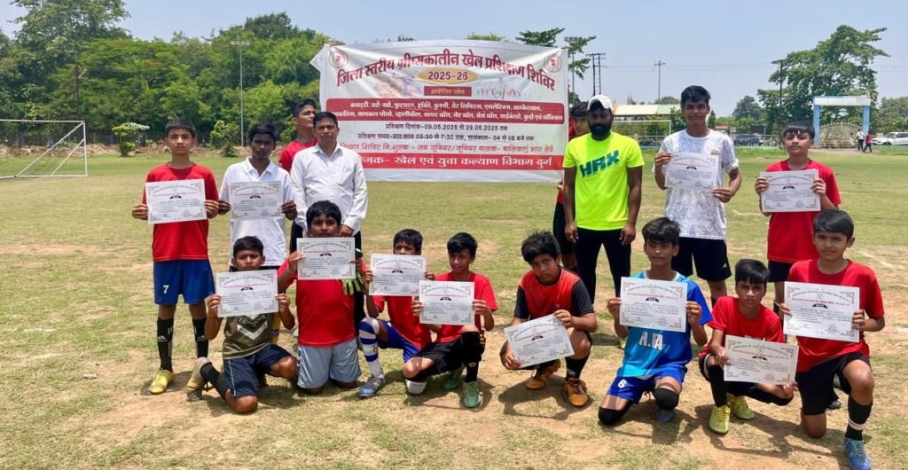 दुर्ग। जिला स्तरीय ग्रीष्मकालीन खेल प्रशिक्षण शिविर 2025-2026 खेल एवं युवा कल्याण विभाग द्वारा 9 मई से 29 मई 2025 तक आयोजित किया गया। जिसमें खेल एवं युवा कल्याण विभाग के फुटबॉल कोच भूपेन्द्र हिरवानी द्वारा हाउसिंग बोर्ड स्टेडियम भिलाई में फुटबॉल खेल का दैनिक प्रशिक्षण दिया।