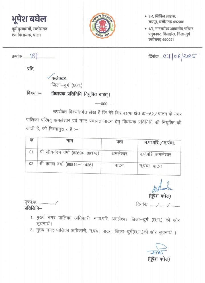 पाटन। पूर्व मुख्यमंत्री एवं विधायक पाटन भूपेश बघेल ने पाटन विधानसभा के नगर पालिका परिषद अमलेश्वर में जीवनंदन वर्मा एवं नगर पंचायत पाटन में कमल किशोर वर्मा को अपना विधायक प्रतिनिधि नियुक्त किया है।