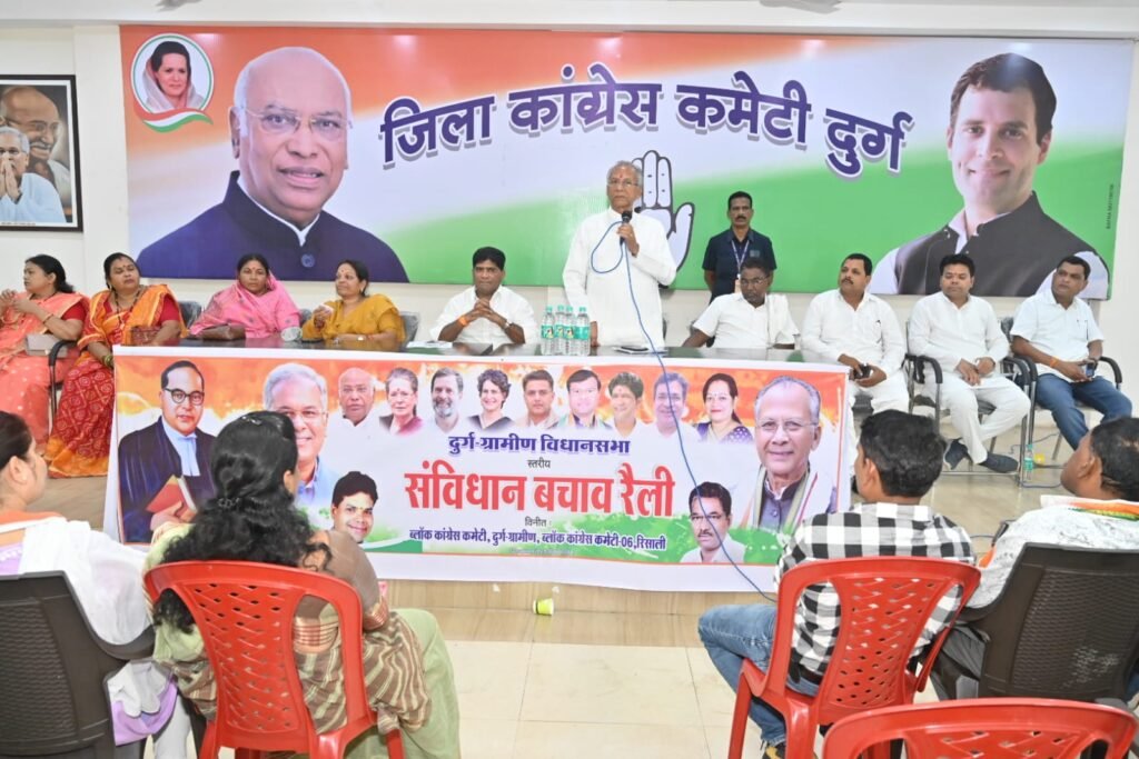 रैली में कांग्रेस के दिग्गज नेताओं ने बीजेपी सरकार पर जमकर निशाना साधा और संविधान बचाने का संकल्प लिया। सभा में जिलेभर से सैकड़ों कार्यकर्ता और पदाधिकारी शामिल हुए।इस अवसर मुख्य रूप से प्रदेश के पूर्व गृहमंत्री ताम्रध्वज साहू ने कहा कि भाजपा पर सीधा हमला करते हुए कहा कि मौजूदा सरकार बाबा साहब अंबेडकर के संविधान को बदलना चाहती है। उन्होंने आरोप लगाया कि बीजेपी देश में नफरत का माहौल बना रही है, जबकि कांग्रेस मोहब्बत और भाईचारे का संदेश देने निकली है। कांग्रेस सरकार के दौरान किसानों के लिए सिंचाई योजनाएं, शिक्षा का अधिकार और मनरेगा जैसी योजनाएं लागू की गईं, जिससे करोड़ों लोगों को लाभ मिला।कांग्रेस सरकार के कार्यकाल में देश को खाद्य सुरक्षा कानून दिया। लेकिन आज की सरकार ने किसानों, युवाओं, मजदूरों और व्यापारियों को हताश कर दिया है।
