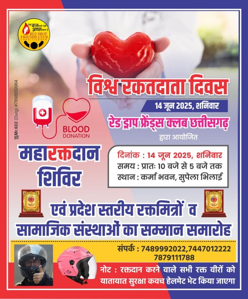 भिलाई। वर्ल्ड ब्लड डोनर डे के उपलक्ष्य में रेड ड्रॉप फ्रेंड्स क्लब छत्तीसगढ़ के द्वारा मेगा ब्लड डोनेशन कैंप का आयोजन 14 जून दिन शनिवार को किया जा रहा है जो सुबह 11 बजे से 5 बजे तक कर्मा भवन सुपेला में आयोजित होगा। प्रदेश स्तरीय रक्त मित्रो एवम सामाजिक संस्थाओं का सम्मान भी किया जाएगा।