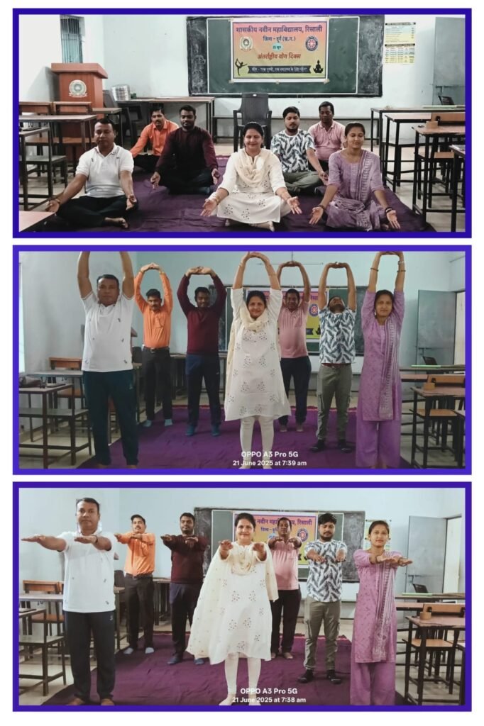 आज दिनांक 21 जून 2025 को शासकीय नवीन महाविद्यालय रिसाली में अंतर्राष्ट्रीय योग दिवस के अवसर पर योगा कार्यक्रम का आयोजन प्रातः 7 बजे किया गया। इस वर्ष “एक पृथ्वी एक स्वास्थ्य ” के थीम पर महाविद्यालय के प्रभारी प्राचार्य प्रो. नूतन कुमार देवांगन एवं राष्ट्रीय सेवा योजना अधिकारी प्रो. वेदप्रकाश सिंह के नेतृत्व में अन्तर्राष्ट्रीय योग दिवस मनाया गया।