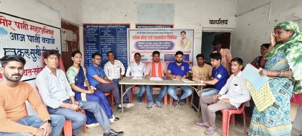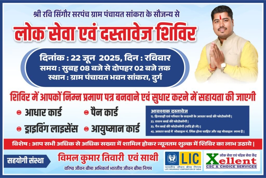 पाटन। ग्राम पंचायत सांकरा मे सरपंच रवि सिंगौर ने ग्रामीणों की सुविधा के लिए ग्राम पंचायत भवन में आज लोक सेवा एवं दस्तावेज शिविर का आयोजन किया था। जिसमे आधार कार्ड, पैन कार्ड, आयुष्मान कार्ड और ड्राइविंग लाइसेंस बनाया गया। शिविर में 200 से अधिक लोगो ने अपने दस्तावेज बनवाने एवं सुधार करवाने पहुंचे।