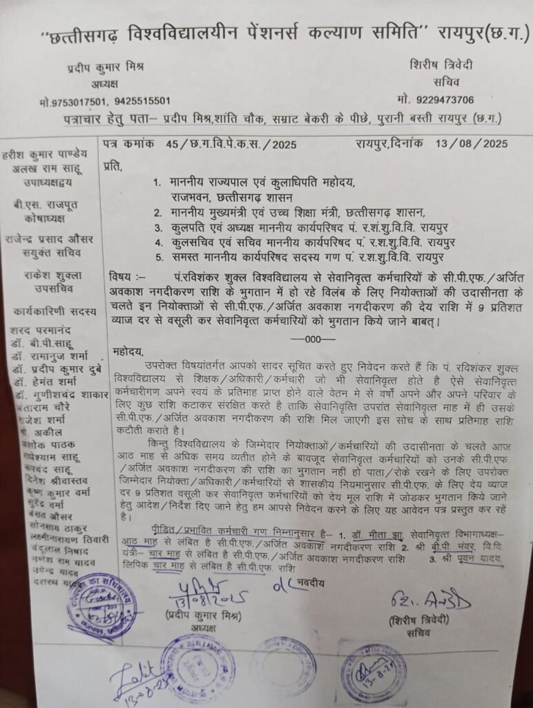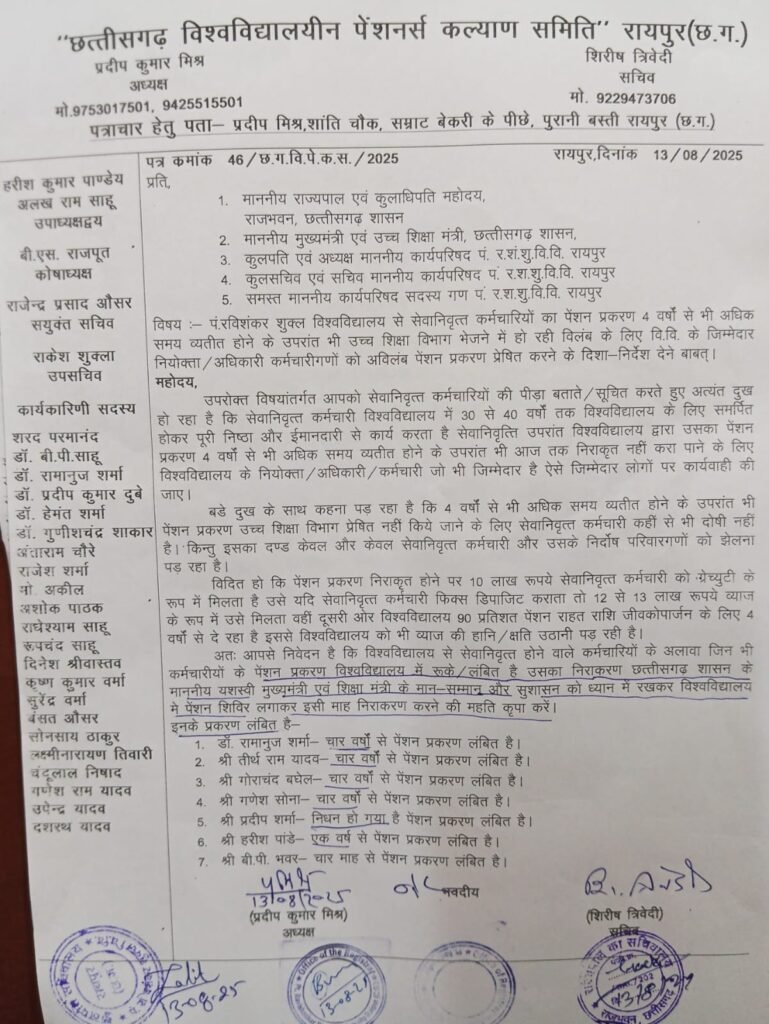 रायपुर,,, पंडित रविशंकर शुक्ल विश्व विद्यालय के सेवानिवृत कर्मचारी गण के,,छत्तीसगढ़ विश्वविद्यालयीय पेशनर्स कल्याण समिति के अध्यक्ष प्रदीप कुमार मिश्र और सचिव शिरीष त्रिवेदी ने बताया कि पंडित रविशंकर शुक्ल वि वि के सेवानिवृत कर्मचारी वि वि मे 30 से 40 वर्षो तक वि वि में अपनी पूरी निष्ठा और ईमानदारी से कार्य करता है सेवानिवृत्ति उपरांत उसका पेंशन प्रकरण उच्च शिक्षा विभाग चार चार वर्षो तक नहीं भेजने के लिए वि वि के जो भी जिम्मेदार नियोक्ता, अधिकारी अथवा कर्मचारी जिम्मेदार है उन लोगों पर कड़ी कार्यवाही की जाये l