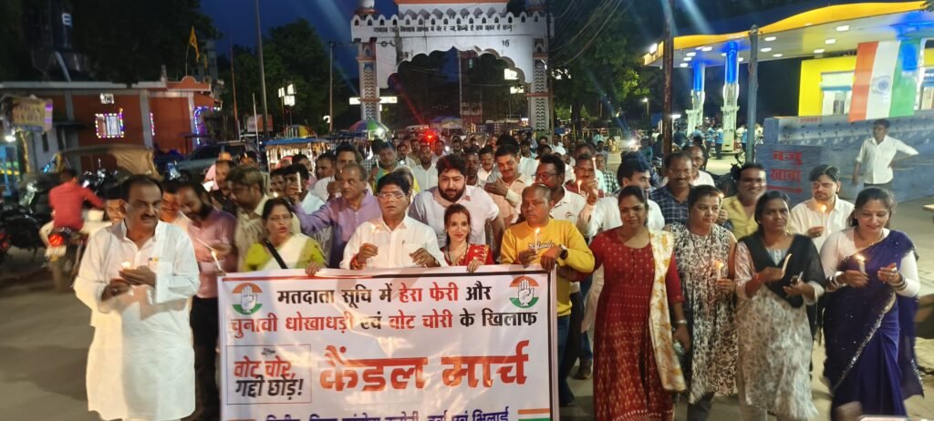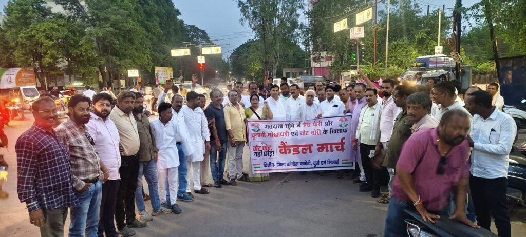 दुर्ग। लोकसभा के नेता प्रतिपक्ष कांग्रेस नेता राहुल गांधी द्वारा मतदाता सूची में हेरा फेरी का चुनावी धोखाधड़ी का वोट चोरी कर भाजपा के चुनाव जीतने के प्रमाण सहित आरोप लगाने पर पूरे देश में निर्वाचन आयोग और प्रधानमंत्री नरेंद्र मोदी की आलोचना हो रही है कांग्रेस नेता राहुल गांधी और पूरी कांग्रेस लगातार निर्वाचन आयोग और प्रधानमंत्री नरेंद्र मोदी के इस कृत्य के लिए उन पर लगातार हमला कर रही है जन आंदोलन कर रही है इसी क्रम में आज दुर्ग ग्रामीण कांग्रेस अध्यक्ष राकेश ठाकुर के नेतृत्व में वोट चोर गद्दी छोड़ अभियान के तहत पटेल चौक से इंदिरा प्रतिमा इंदिरा मार्केट तक कैंडल मार्च निकालकर निर्वाचन आयोग और मोदी के खिलाफ नारेबाजी करते लोकतंत्र की हत्या करने वाले निर्वाचन आयोग और नरेंद्र मोदी के खिलाफ वोट चोर गद्दी छोड़ अभियान शुरू किया । और जनता के सामने इनकी करतूत को बताया।