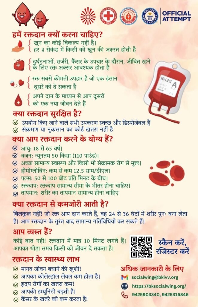 रक्तदान महाअभियान राष्ट्रीय कार्यक्रम की अधिक जानकारी हेतु सेक्टर 7,सड़क 2 स्थित राजयोग भवन में भी संपर्क कर सकते हैं।