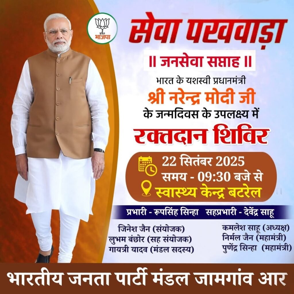 जामगांव आर। प्रधानमंत्री नरेंद्र मोदी के जन्मदिवस अवसर पर भारतीय जनता पार्टी द्वारा चलाए जा रहे सेवा पखवाड़ा के तहत ग्राम बटरेल में आज रक्तदान शिविर आयोजित किया जाएगा। शिविर में पूर्व केबिनेट मंत्री रमशीला साहू एवं भाजपा छत्तीसगढ़ प्रदेश मंत्री जितेंद्र वर्मा विशेष रूप से शामिल होंगे।