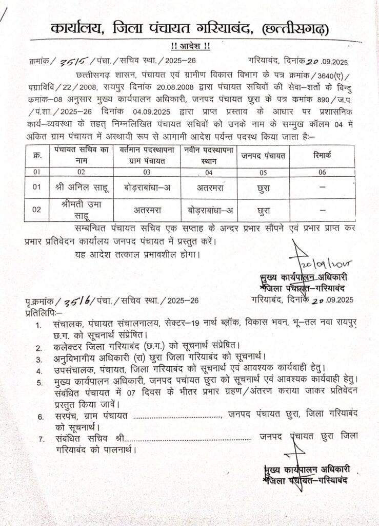 पांडुका(छुरा) /अंचल के ग्राम पंचायत अतरमरा अपने अलग कार्य प्रणाली के लिए जाना जाता है । पंचायत चुनाव हुए अभी महज 7 से 8 महीने हुए हैं ऐसे में यहां दो सचिव का तबादला हो गया और तीसरा अभी आने वाला है इस प्रकार इस ग्राम पंचायत में जुलाई माह में गए पंचायत सचिव चेतन सोनकर की जगह सरकड़ा की उमा साहू आई थी। अब सचिव उमा साहू लगभग दो महीने में ही यहां से ट्रांसफर होकर बोडरा बांधा जा रही है और ग्राम पंचायत बोडरा बांधा के सचिव अनिल साहू अतरमरा आ रहे हैं ऐसे में जाने क्यों इस ग्राम पंचायत में कोई भी सचिव नहीं टिक पा रहा है ।वही ग्राम पंचायत की बदहल व्यवस्था को लेकर ग्रामीणों में खासी नाराजगी भी देखी जा रही है ।