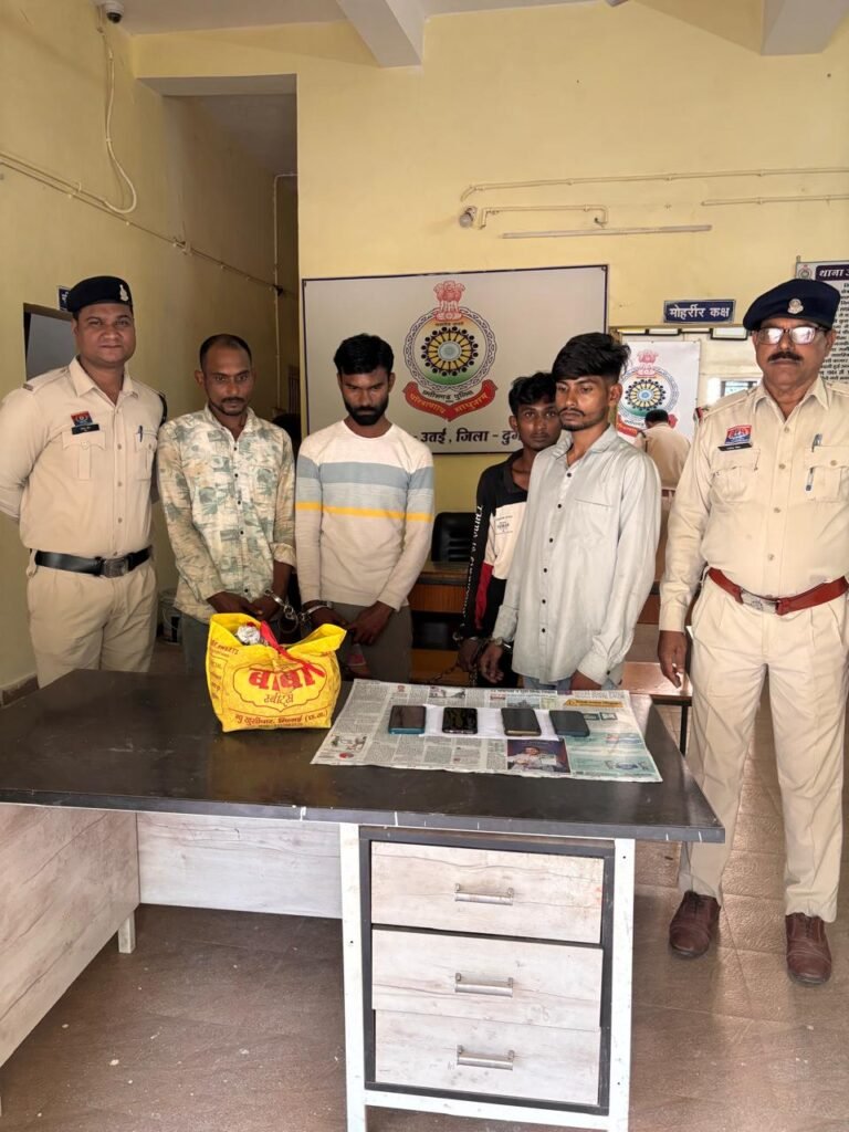 दुर्ग। नशे के विरुद्ध चलाए जा रहे ऑपरेशन “विश्वास” के तहत दुर्ग पुलिस को बड़ी सफलता मिली है। उतई थाना पुलिस ने गांजा की अवैध बिक्री में लिप्त चार आरोपियों को गिरफ्तार किया है। पुलिस ने आरोपियों से मादक पदार्थ गांजा, मोबाइल फोन और मोटरसायकल जब्त की है।