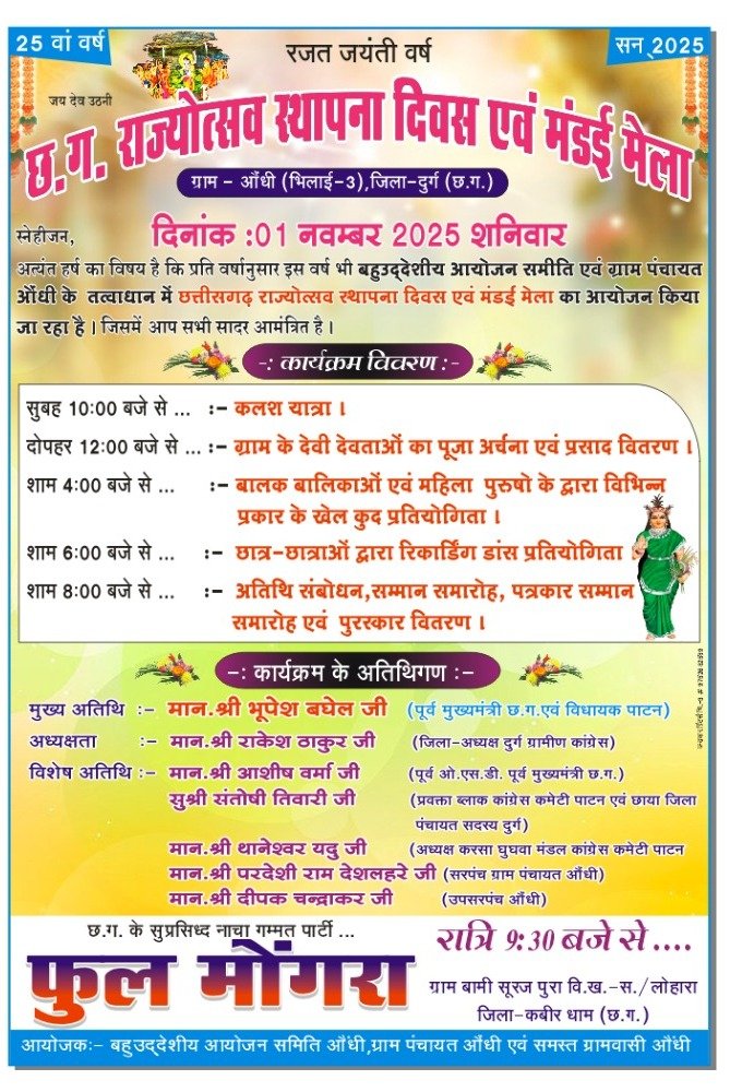पाटन। ग्राम औंधी में इस वर्ष छत्तीसगढ़ राज्य स्थापना दिवस एवं मंडाई मेला समारोह का आयोजन विशेष रूप से रजत जयंती वर्ष के रूप में किया जा रहा है। राज्य निर्माण के बाद से अब तक लगातार 25 वर्षों से ग्राम औंधी में यह आयोजन बिना किसी व्यवधान के जारी है, जो इसे प्रदेश का एक विशिष्ट ग्राम बनाता है।