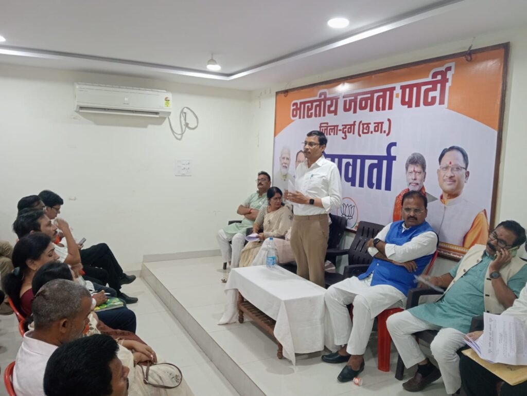 दुर्ग जिला भाजपा अध्यक्ष सुरेन्द्र कौशिक, भिलाई जिला भाजपा अध्यक्ष पुरुषोत्तम देवांगन, निगम सभापति श्याम शर्मा जिला उपाध्यक्ष शिवेंद्र परिहार मंचस्थ रहे। बैठक का संचालन जिला महामंत्री दिलीप साहू ने किया एवं आभार प्रदर्शन जिला महामंत्री विनोद अरोरा ने किया।आयोजित बैठक में जिला उपाध्यक्ष सरिता मिश्रा राजीव पांडेय मंत्री गायत्री वर्मा, गिरेश साहू, शैलेंद्र शैंडे, सह कोषाध्यक्ष ध्रुव सचदेव कार्यालय मंत्री सैयद आसिफ अली सह कार्यालय मंत्री राहुल पंडित प्रवक्ता दिनेश देवांगन मीडिया प्रभारी राजा महोबिया, सोशल मीडिया प्रभारी रजनीश श्रीवास्तव, आईटी सेल जिला संयोजक जितेंद्र सिंह राजपूत, मंडल भाजपा अध्यक्ष महेंद्र अरोरा, कमलेश फेकर, बंटी चौहान, कौशल साहू, मनमोहन शर्मा, अनुपम साहू, राजू जंघेल, मंडल महामंत्री भुपेंद्र साहू, रितेश शर्मा ,जय श्री राजपूत सुमन वर्मा उमेश गिरी ताम्रध्वज साहू राजू साहू भूपेंद्र साहू एमआईसी सदस्य नीलेश अग्रवाल शेखर चंद्राकर काशीराम कोसरे शिव नायक मनीष साहू उपस्थित रहे |