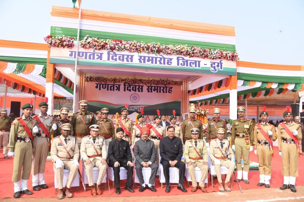 दुर्ग। 77 वां गणतंत्र दिवस समारोह दुर्ग जिले में पूरे हर्षाेल्लास के साथ मनाया गया। मुख्य अतिथि केन्द्रीय आवासन एवं शहरी कार्य राज्यमंत्री तोखन साहू ने दुर्ग के रविशंकर स्टेडियम में आयोजित 26 जनवरी गणतंत्र दिवस के मुख्य समारोह में ध्वजारोहण कर परेड की सलामी ली। इस अवसर पर राज्यमंत्री श्री साहू ने मुख्यमंत्री श्री विष्णुदेव साय का प्रदेश की जनता के नाम संदेश का वाचन किया। उन्होंने उल्लास एवं उमंग के प्रतीक रंगीन गुब्बारे आसमान में छोड़े।