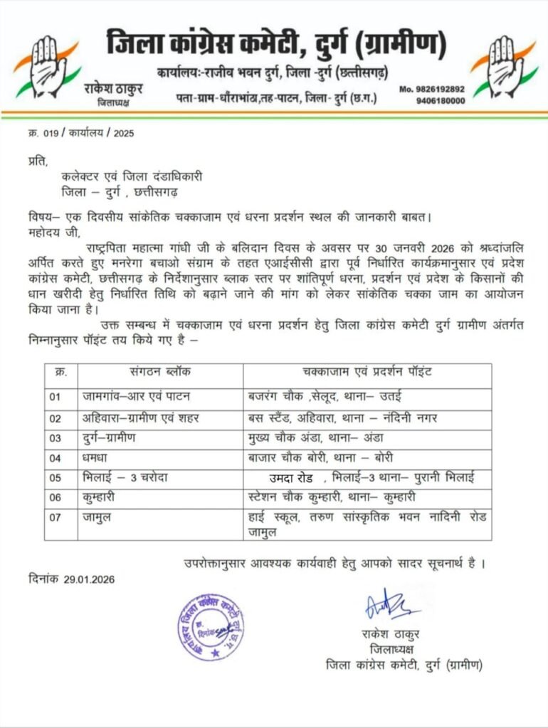 दुर्ग। राष्ट्रपिता महात्मा गांधी जी के बलिदान दिवस के अवसर पर 30 जनवरी 2026 को जिला कांग्रेस कमेटी दुर्ग (ग्रामीण) जिलाध्यक्ष राकेश ठाकुर के नेतृत्व में एकदिवसीय सांकेतिक चक्काजाम एवं धरना-प्रदर्शन का आयोजन दुर्ग जिले के 7 स्थान पर किया जाएगा जिसके लिए अलग अलग पॉइंट बनाया गया है। यह कार्यक्रम अखिल भारतीय कांग्रेस कमेटी (एआईसीसी) के निर्देशानुसार तथा प्रदेश कांग्रेस कमेटी, छत्तीसगढ़ के मार्गदर्शन में शांतिपूर्ण रूप से संपन्न किया जाएगा।