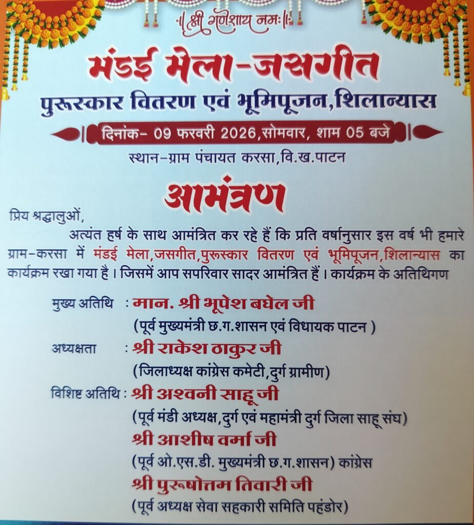 पाटन। ग्राम पंचायत करसा, विकासखंड पाटन में प्रतिवर्ष आयोजित होने वाला पारंपरिक मंडई मेला–जसगीत इस वर्ष भी उत्साह के साथ आयोजित किया जा रहा है। कार्यक्रम के अंतर्गत पुरस्कार वितरण, भूमिपूजन एवं शिलान्यास का आयोजन सोमवार, 09 फरवरी 2026, शाम 5 बजे ग्राम पंचायत करसा में किया जाएगा।