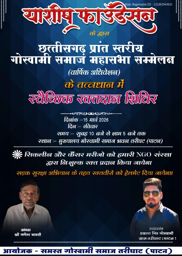 पाटन। छत्तीसगढ़ प्रांत स्तरीय गोस्वामी समाज महासभा सम्मेलन (वार्षिक अधिवेशन) के अवसर पर गोसाई फाउंडेशन द्वारा 15 मार्च 2026, रविवार को स्वैच्छिक रक्तदान शिविर का आयोजन किया जाएगा।