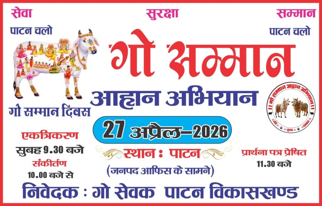 पाटन। गो सेवा, सुरक्षा एवं सम्मान के उद्देश्य से “गो सम्मान आह्वान अभियान” के तहत गो सम्मान दिवस का आयोजन दिनांक 27 अप्रैल 2026 को पाटन में किया जाएगा। यह कार्यक्रम जनपद कार्यालय के सामने आयोजित होगा, जिसमें क्षेत्र के बड़ी संख्या में गौसेवक एवं सामाजिकजन शामिल होंगे।