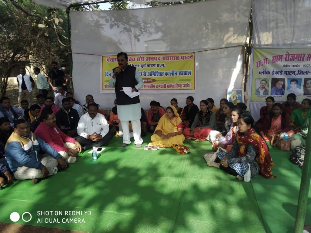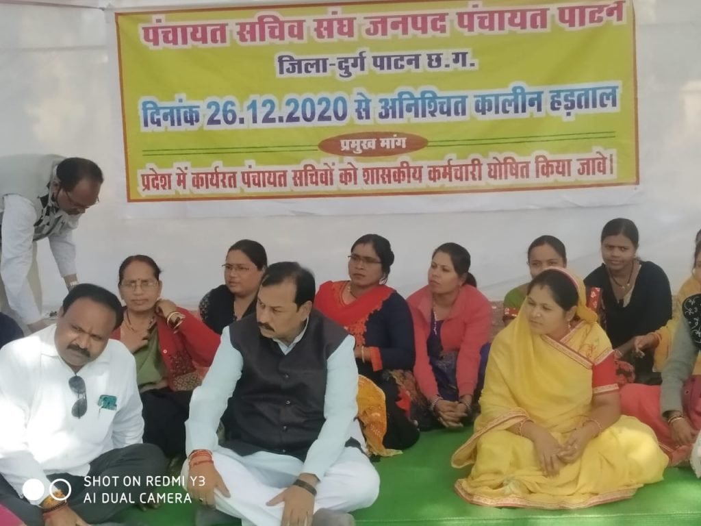 पाटन। शासन के पंचायत विभाग के सचिव विगत 26 दिसम्बर से पंचायत सचिवों को शासकीय कर्मचारी घोषित करने की मांग को लेकर आंदोलनरत है इसी प्रकार से ग्राम रोजगार संघ भी वेतनमान निर्धारण एवं नियमितीकरण की मांग लेकर 30दिसम्बर से जनपद पंचायत भवन के सामने धरने पर बैठे है।