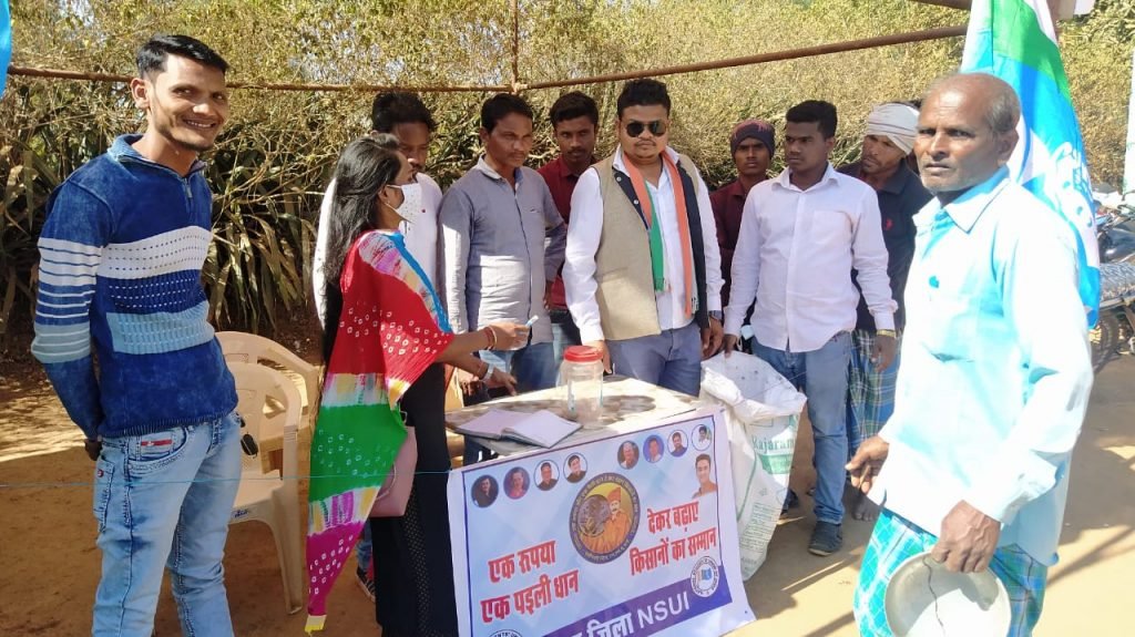 इसलिए किसान भाइयों का साथ देने प्रदेश अध्यक्ष आकाश शर्मा के नेतृत्व में बस्तर जिला NSUI की टीम विभिन्न धान खरीदी क्रेन्द्रों पर जा कर एक रुपया और एक पइली धान किसानों से लेकर दिल्ली में आंदोलन कर रहे किसानों के समर्थन में पूरे प्रदेश से एकत्रित कर दिल्ली भेजा जाएगा।