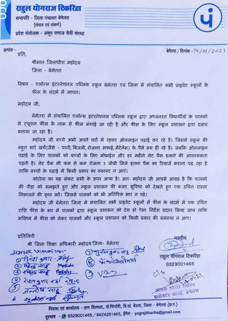 जिलाधीश बेमेतरा को सौपे गए ज्ञापन में सभापति टिकरिहा एवं पालकों ने लिखा है कि “बेमेतरा में संचालित एलॉन्स इंटरनेशनल पब्लिक स्कूल द्वारा अध्यनरत विद्यार्थीयों के पालको से ट्यूशन फीस के नाम से फीस मंगाई जा रही है और फीस के लिए स्कूल प्रशासन द्वारा दबाव बनाया जा रहा है।