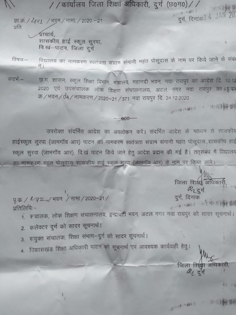 पाटन—विदित हो कि पाटन तहसील में सतनामी समाज से 2 स्वतंत्र संग्राम सेनानी हुए जिसमें छाटा से भूतनाथ जी जो विधायक भी रहे एवं सुरपा से महंत पोसूदास जी। तथा जामगांव आर क्षेत्र के लोगों ने स्वतंत्रता संग्राम सेनानी महंत पोसूदास जी के स्वतंत्रता संग्राम में अमूल्य योगदान को चिरस्थाई बनाए रखने के लिए क्षेत्र के शासकीय हाई स्कूल सुरपा का नामकरण “महंत पोसूदास शासकीय हाई स्कूल सुरपा” करने की मांग शासन के स्कूल शिक्षा विभाग से की थी। जिस पर छत्तीसगढ़ शासन स्कूल शिक्षा विभाग मंत्रालय महानदी भवन नया रायपुर से 10 दिसंबर 2020 राज्यपाल के नाम से जारी आदेश में शासकीय हाई स्कूल सुरपा का नामकरण “महंत पोसूदास शासकीय हाई स्कूल सुरपा” किए जाने का आदेश जारी किया गया है। जिसके पालन में जिला शिक्षा अधिकारी दुर्ग द्वारा 14 जनवरी 2021 को प्राचार्य शासकीय हाई स्कूल सूरपा को विद्यालय का नामकरण स्वतंत्रता संग्राम सेनानी “महंत पोसूदास शासकीय हाई स्कूल सुरपा”के नाम पर किए जाने की आदेश जारी किए हैं।
