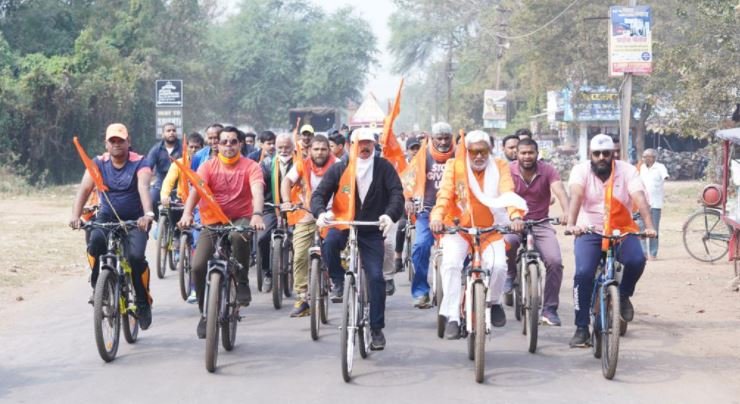 भिलाई । टाउनशिप में श्री राम मंदिर निर्माण निधि अभियान के तहत गुरुवार को श्रीराम जन्मोत्सव समिति द्वारा जनजागरण सायकल रैली निकाली गई। इस दौरान भारत माता की जय व जय श्रीराम के जयघोष से माहौल भक्तिमय हो गया। सायकल रैली में बड़ी संख्या में उपस्थित श्रीराम भक्तों ने टाउनशिप के विभिन्न सेक्टरों का भ्रमण करते हुए जन-जन तक इस अभियान में अपनी स्वेच्छानुसार सहयोग करने का आव्हान किया।