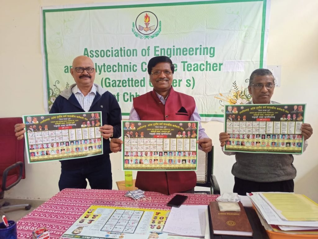 छत्तीसगढ़ प्रदेश तृतीय वर्ग शासकीय कर्मचारी संघ के जिला शाखा सचिव, हर्षवर्धन श्रीवास्तव ने बताया कि, शासकीय कर्मचारी संघ के वार्षिक कैलेण्डर का विमोचन, प्रदेश स्तर, संभाग स्तर एवं जिला स्तर पर किया जा रहा है। इसी कड़ी में आज छत्तीसगढ़ इंजीनियरिंग एवं पॉलिटेक्निक कॉलेज राजपत्रित अधिकारी संघ के प्रांताध्यक्ष शंकर वराठे एवं श्री एस एन कामडे विभागाध्यक्ष सिविल के कर-कमलों से संयुक्त रुप से शासकीय कर्मचारी संघ के वार्षिक कैलेण्डर का विमोचन शासकीय पोलीटेक्निक दुर्ग में कराया गया।