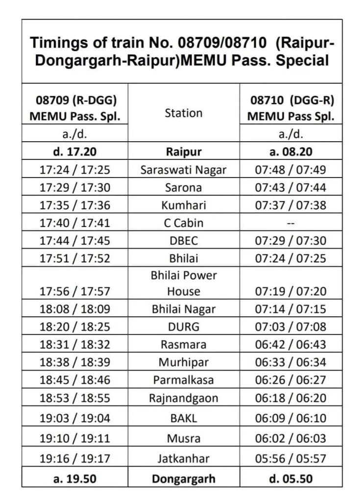 रेल यात्रियों की सुविधाओ एवं मांग को ध्यान में रखते हुए रेल प्रशासन द्वारा दक्षिण पूर्व मध्य रेल्वे के बिलासपुर-रायपुर-डोंगरगढ़ के मध्य से 12 सवारी स्पेशल ट्रेनों का परिचालन12 फरवरी से शुरू किया जा रहा है। इन गाडिय़ों में गाड़ी संख्या 08261/ 08262 बिलासपुर-रायपुर-बिलासपुर सवारी स्पेशल ट्रेन का परिचालन 12 फरवरी से, गाड़ी संख्या 08727/08728 बिलासपुर-रायपुर-बिलासपुर मेमू स्पेशल ट्रेन का परिचालन दिनांक 13 एवं 14 फरवरी से, गाड़ी संख्या 08703/08704 रायपुर-दुर्ग-रायपुर मेमू स्पेशल ट्रेन का परिचालन 12 फरवरी से, गाड़ी संख्या 08717 रायपुर-दुर्ग मेमू स्पेशल ट्रेन का परिचालन 14 फरवरी से, गाड़ी संख्या 08708 दुर्ग-रायपुर मेमू स्पेशल का परिचालन 15 फरवरी से, गाड़ी संख्या 08705/08706 रायपुर-डोंगरगढ़-बिलासपुर मेमू स्पेशल का परिचालन 13 फरवरी से तथा गाड़ी संख्या 08709/ 08710 रायपुर-डोंगरगढ़-रायपुर मेमू स्पेशल का परिचालन 12 एवं 13 फरवरी से किया जाएगा। इन गाडिय़ों का परिचालन रेल प्रशासन के आगामी निर्देश तक जारी रहेगी ।