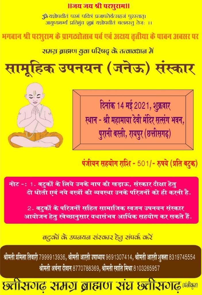 समग्र ब्राह्मण युवा परिषद् रायपुर के जिलाध्यक्ष पं.अखिलेश त्रिपाठी एवं संयोजक पं.अजय पाठक ने कार्यक्रम के संबंध में जानकारी देते हुये बताया कि समग्र ब्राह्मण युवा परिषद् रायपुर के तत्वावधान में समग्र ब्राह्मण परिषद् छत्तीसगढ़ के सहयोग से रायपुर के प्राचीनतम मंदिर श्री महामाया देवी मंदिर के सत्संग भवन में यह आयोजन किया जा रहा है जिसमें 51 बटुकों का उपनयन संस्कार करवाया जायेगा.