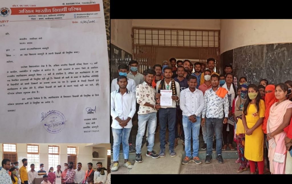बस्तर। अखिल भारतीय विद्यार्थी परिषद भानपुरी इकाई के द्वारा शुक्रवार को भानपुरी कालजे में नियमित प्रध्यापको की नियुक्ति के माँग को लेकर ज्ञापन सौंपा।