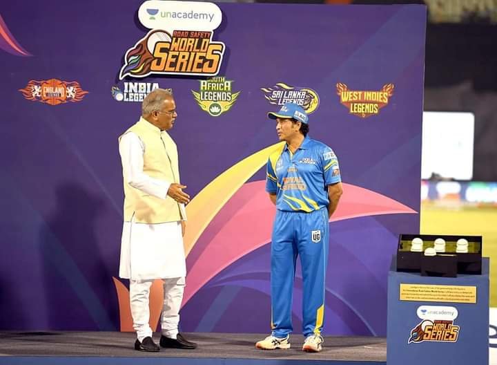 रायपुर—मुख्यमंत्री भूपेश बघेल द्वारा आज छत्तीसगढ़ की राजधानी रायपुर के शहीद वीर नारायण सिंह अंतरराष्ट्रीय क्रिकेट स्टेडियम में किए गए शुभारंभ के साथ ही रोड सेफ्टी क्रिकेट टी-20 वर्ल्ड सीरीज की शुरुआत हो गई। सीरीज का शुभारंभ शानदार आतिशबाजी के साथ हुआ। मुख्यमंत्री श्री भूपेश बघेल ने रोड सेफ्टी संकल्प पर हस्ताक्षर किए और रोड सेफ्टी वर्ल्ड क्रिकेट सीरीज के शुभारंभ की घोषणा की। पहला मैच इंडिया लीजेंड्स और बांग्लादेश लीजेंड्स के बीच हुआ। क्रिकेट मैच का शुभारंभ बांग्लादेश और भारत के राष्ट्र-गान के साथ हुआ। इस क्रिकेट-श्रृंखला के उद्घाटन अवसर पर मुख्यमंत्री श्री बघेल ने छत्तीसगढ़ की 02 करोड़ 80 लाख जनता की ओर से इस वर्ल्ड सीरीज में शामिल हो रहे सभी खिलाड़ियों का स्वागत किया। उन्होंने कहा कि क्रिकेट के भगवान कहे जाने वाले सचिन तेंदुलकर यहां पहुंचे हैं। साथ ही युवराज सिंह, मोहम्मद कैफ, मुनाफ पटेल, वीरेंद्र सहवाग समेत भारतीय और बांग्लादेश के सभी क्रिकेट सितारे यहां पहुंचे हैं।