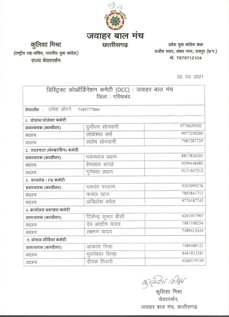 मैंनपुर। जवाहर बाल मंच का गठन किया युवा कांग्रेस जवाहर बाल मंच की जिला कार्यकारिणी कर्नाटक से होने वाले घोषणा प्रदेश चेयर पर्सन कुलिसा जवाहर बाल मंच विस्तर करते हुए मिश्रा ने गरियाबंद जिले की पन्द्रह सदस्यीय सूची जारी की है,जवाहर बाल मंच में 10वर्ष से 17 साल तक के बच्चों के लिए बनाई गई है।यह संगठन का नाम भारत के प्रधानमंत्री जवाहरलाल नेहरू जी के नाम पर रखा गया है।बाल मंच के चेयरमैन उमेश डोंगरे ने जिले के कार्यकारिणी सदस्य की विस्तार में प्रोग्राम समन्वय दुर्योधन सोनवानी,सदस्य लोकेश्वर वर्मा व संतोष सोनवानी,सदस्यता कमेटी समन्वय मकरध्वज प्रधान,सदस्य हेमलाल बारले व गुनेश्वर प्रधान, फाइनेंस कमेटी समन्वय यशवंत मरकाम,सदस्य फैजल खान व अखिलेश बघेल,कार्यालय प्रशासन कमेटी समन्वय केंद्र कुमार बीसी, सदस्य देवाशीष यादव, व लक्ष्मण यादव,सोशियल मीडिया कमेटी समन्वय आकाश मिश्रा, सदस्य भुवनेश्वर सिन्हा व दीपक तिवारी को कमान सौंपी गई है।
