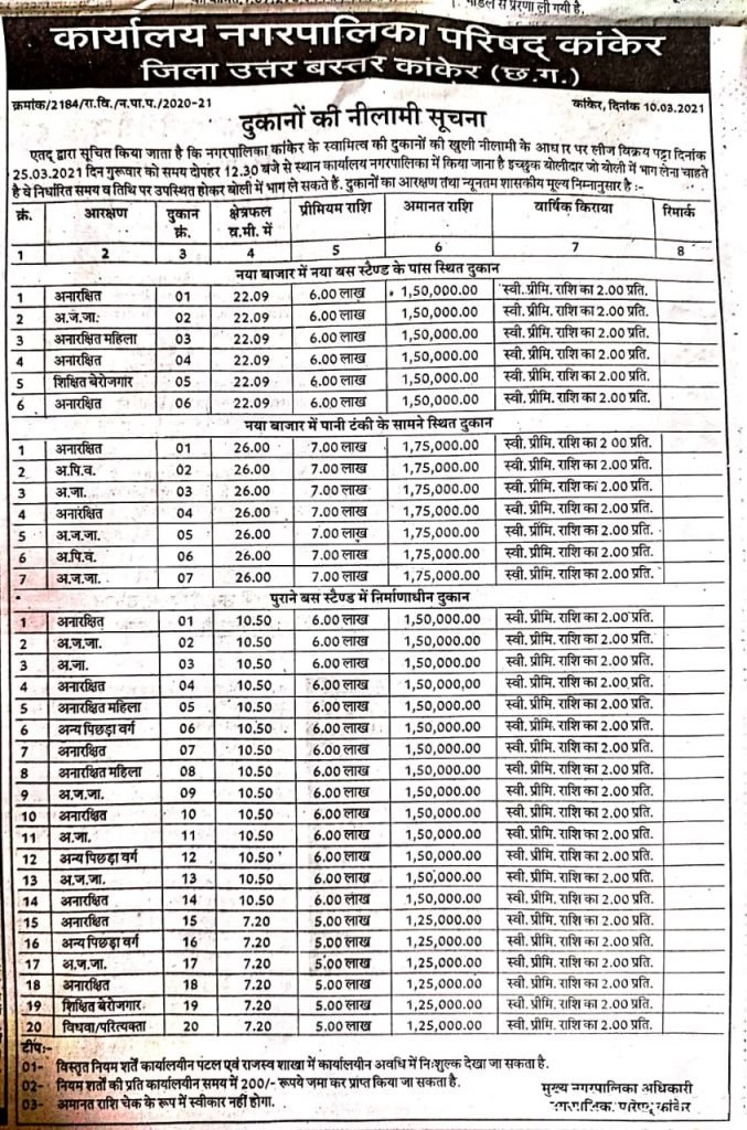 20 दुकानों को बेचने का नगर पालिका परिषद कांकेर ने विज्ञापन निकाला