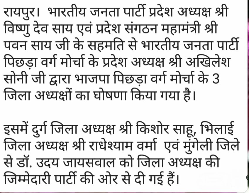किशोर साहू बने भाजपा पिछड़ा वर्ग मोर्चा दुर्ग जिलाध्यक्ष Posted on March 11, 2021March 11, 2021Author kuldeepkurre360@gmail.com 0