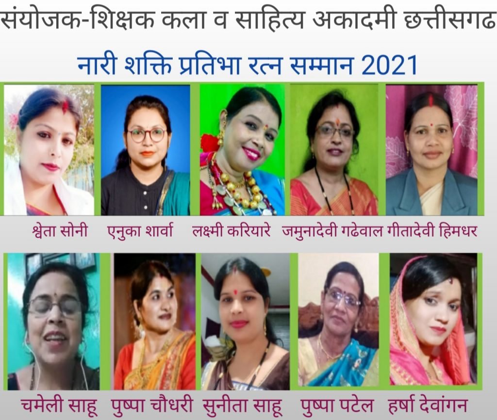 बहुआयामी क्षेत्र में श्वेता सोनी, नृत्य के क्षेत्र में एनुका शार्वा, गायन के क्षेत्र में लक्ष्मी करियारे, साहित्य के क्षेत्र में जमुना देवी गढ़ेवाल ,शिक्षा के क्षेत्र में गीता देवी हिमधर, वादन के क्षेत्र में चमेली साहू ,कला के क्षेत्र पुष्पा चौधरी नवाचार के क्षेत्र सुनीता सिंह, सेवा के क्षेत्र में पुष्पा पटेल “पुष्प”, सांस्कृतिक क्षेत्र में हर्षा देवांगन सम्मानित किया गया।