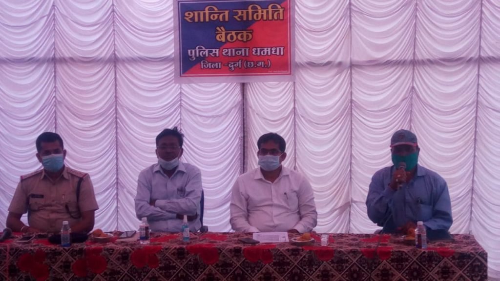 धमधा—– पुलिस अधीक्षक प्रशांत ठाकुर के निर्देशन में थाना प्रभारी त्रिनाथ त्रिपाठी द्वारा थाना परिसर में होली त्यौहार को लेकर आवश्यक बैठक बुलाई गई बैठक में मुख्य रूप से एसडीएम बृजेश क्षत्रिय तहसीलदार रामकुमार सोनकर व बीएमओ डॉ डी पी ठाकुर विशेष रूप से उपस्थित थे बृजेश क्षत्रिय ने कहा कि होली त्यौहार को लेकर जिला प्रशासन ने गाइडलाइन तय की है उसके अनुसार से त्योहार मनाए जिले में बढ़ती कोरोना को देखते हुए लापरवाही न बरतें ताकि इसका गलत परिणाम मिले भीड़ ना बढ़ाएं मास्क अवश्य लगाएं सेनीटाइजर का उपयोग करें 2 गज की दूरी भी अवश्य रखें वही तहसीलदार रामकुमार सोनकर में कोरोना के प्रति सब को जागरूक रहने की हिदायत दी होली शालीनता से मनाने की बात कही बीएमओ डॉ डी पी ठाकुर ने कहा कि सामुदायिक स्वास्थ्य केंद्र में सभी प्रकार के सुविधाओं की व्यवस्था की गई है 60 से अधिक उम्र वाले वैक्सीन लगवाएं स्वास्थ्य विभाग सहयोग के लिए खड़ी है कोरोना से हमको मिलकर लड़ना है बैठक में विशेष बात यह रही कोरोना को लेकर प्रशासन गंभीर दिखाई दी उन्होंने कहा कि जब तक हम सजग नहीं रहेंगे तब तक हम कोरोना से विजय नहीं पा सकते सबको मिलकर लड़ना है थाना प्रभारी त्रिनाथ त्रिपाठी ने आभार व्यक्त किया इस अवसर पर जनपद अध्यक्ष सरस्वती रात्रे लाला सिंह ठाकुर कुमार पटेल अनिल जोशी प्रदीप ताम्रकार मुकुल आनंद यादव लितेश ताम्रकार आशीष ताम्रकार आरुणि दानी आशीष पांडे के साथ क्षेत्र के पंच सरपंच जनप्रतिनिधि गण काफी संख्या में उपस्थित थे