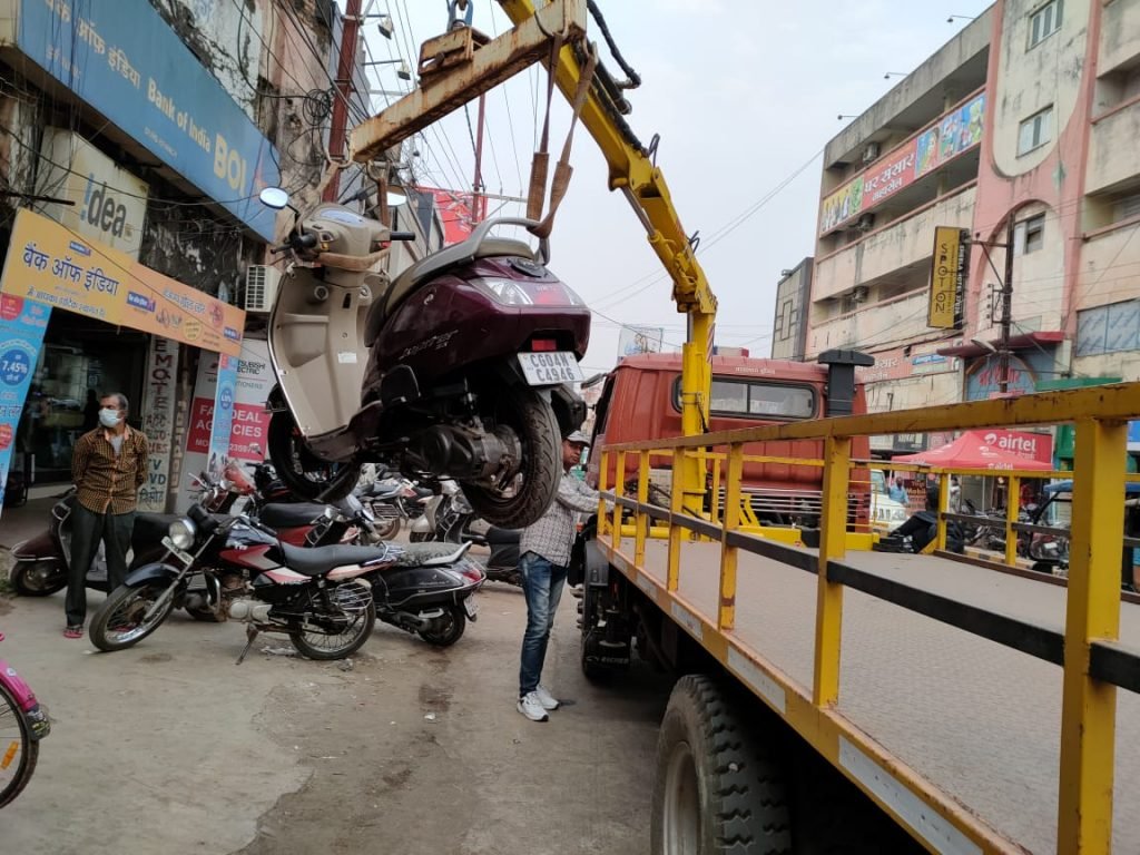 दुर्ग।प्रशांत ठाकुर, पुलिस अधीक्षक, दुर्ग के द्वारा पूर्व में दिये गये निर्देश के परिपालन में एवं गुरजीत सिंह, उप पुलिस अधीक्षक, (यातायात) के नेतृत्व में यातायात पुलिस दुर्ग द्वारा निरंतर नो पार्किग में खडे वाहनों पर चस्पा की कार्यवाही की जा रही है इंदिरा मार्केट दुर्ग में नो पार्किग में खडी दो पहिया वाहनो को क्रेन से उठाकर यातायात जोन कार्यालय दुर्ग लाया गया जप्त वाहनों के मालिकों के ऊपर मोटर व्हीकल एक्ट के तहत चालानी कार्यवाही कर एवं भविष्य के लिए समझाईस देकर वाहनों को छोडा गया।