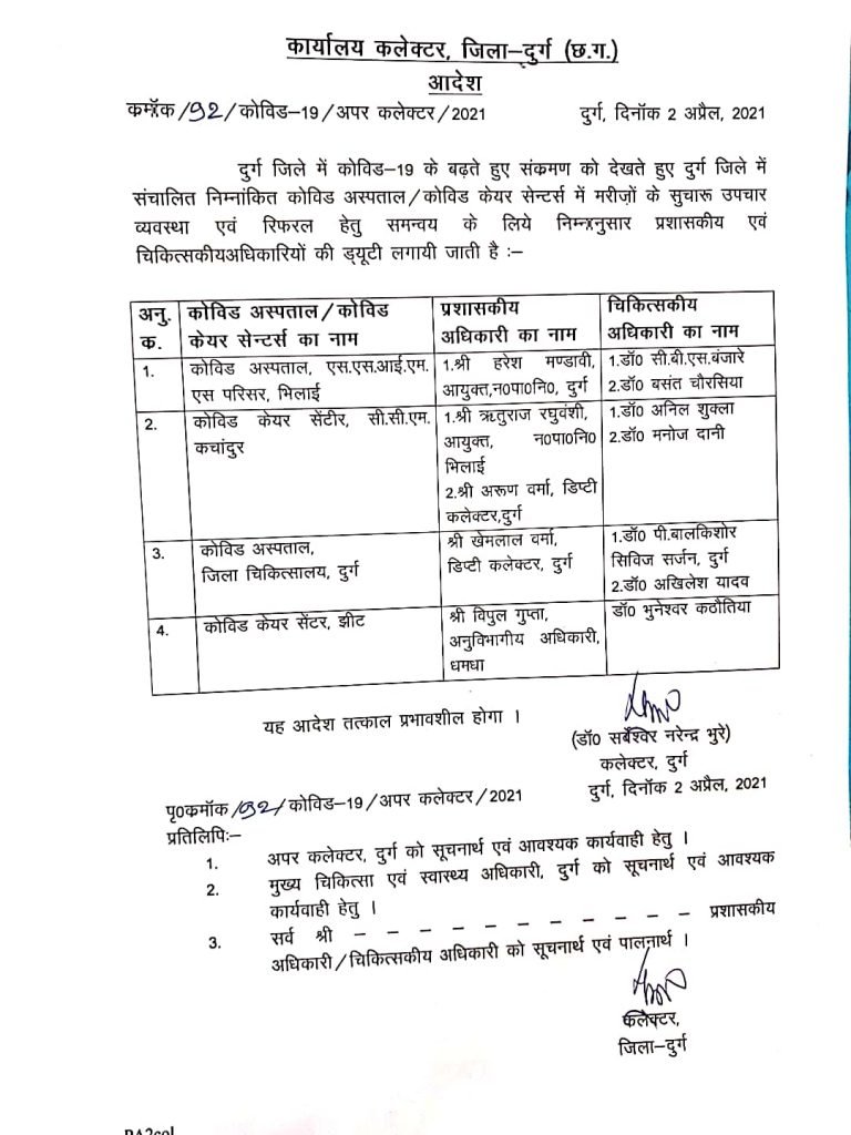 दुर्ग ।जिले में कोविड-19 के बढ़ते हुए संक्रमण को देखते हुए। जिले में संचालित कोविड-19 हॉस्पिटल व कोविड-19 सेंटर में समन्वय के लिए कलेक्टर डॉ. सर्वेश्वर नरेंद्र भुरे के निर्देशानुसार मरीजों के सुचारु उपचार व्यवस्था के लिए प्रशासकीय एवं चिकित्साकीय अधिकारियों की ड्यूटी लगाई गई है। कोविड-19 हॉस्पिटल एस.एस.आई.एम.एस परिसर भिलाई के लिए प्रशासकीय अधिकारी श्री हरेश मंडावी आयुक्त नगर पालिका निगम दुर्ग तथा चिकित्सकीय अधिकारी डॉ. सी.बी.एस बंजारे और डॉ. बसंत चौरसिया होंगे । कोविड-19 सेंटर सी.सी.एम कचांदूर के लिए प्रशासकीय अधिकारी श्री ऋतुराज रघुवंशी आयुक्त नगर पालिका निगम भिलाई, श्री अरुण वर्मा डिप्टी कलेक्टर दुर्ग तथा चिकित्सकीय अधिकारी डॉ. अनिल शुक्लाऔर डॉ. मनोज दानी होंगे। कोविड-19 जिला चिकित्सालय दुर्ग के लिए प्रशासकीय अधिकारी श्री खेमलाल वर्मा डिप्टी कलेक्टर दुर्ग तथा चिकित्सकीय अधिकारी डॉ. पी. बालकिशोर सिविल सर्जन दुर्ग और डॉ. अखिलेश यादव होंगे। कोविड केयर सेंटर के लिए श्री विपुल गुप्ता अनुविभागीय अधिकारी धमधा चिकित्सकीय अधिकारी डॉ. भुनेश्वर कठौतिया होंगे।
