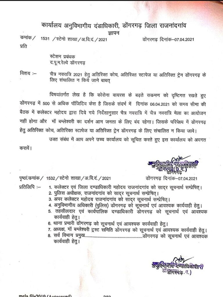 राजनादगांव। छत्तीसगढ़ के प्रसिद्ध देवी मंदिर डोंगरगढ़ में इस बार चैत नवरात्रि पर्व में नवरात्रि मेला का आयोजन नही होगा।अनुविभागीय दंडाधिकारी डोंगरगढ़ ने स्टेशन प्रबंधक को ट्रेनो के स्टॉपेज ना देने हेतु आज ज्ञापन दिया।