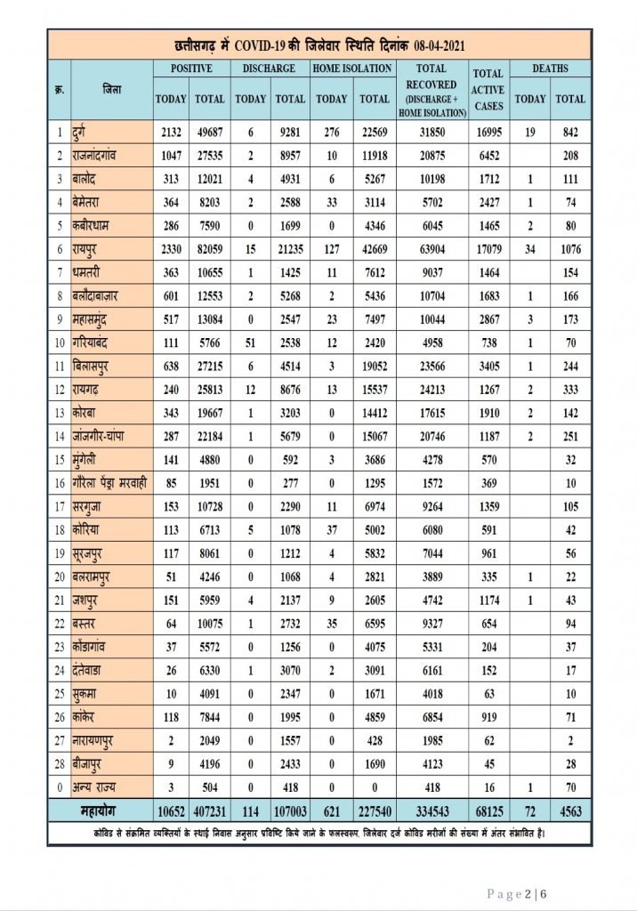 रायपुर। प्रदेश में कोरोना का कहर लगातार जारी है। गुुरुवार को 10,652 नए कोरोना पॉजिटिव मरीज़ों की पहचान हुई वहीं 735 मरीज़ स्वस्थ होने के उपरांत डिस्चार्ज/रिकवर्ड हुए। वही कोरोना से एक दिन में 72 लोगों की मौत हो गई। जिसमें रायपुर में 34 लोगों की एवं दुर्ग जिले में 19 की मौत हुई है।