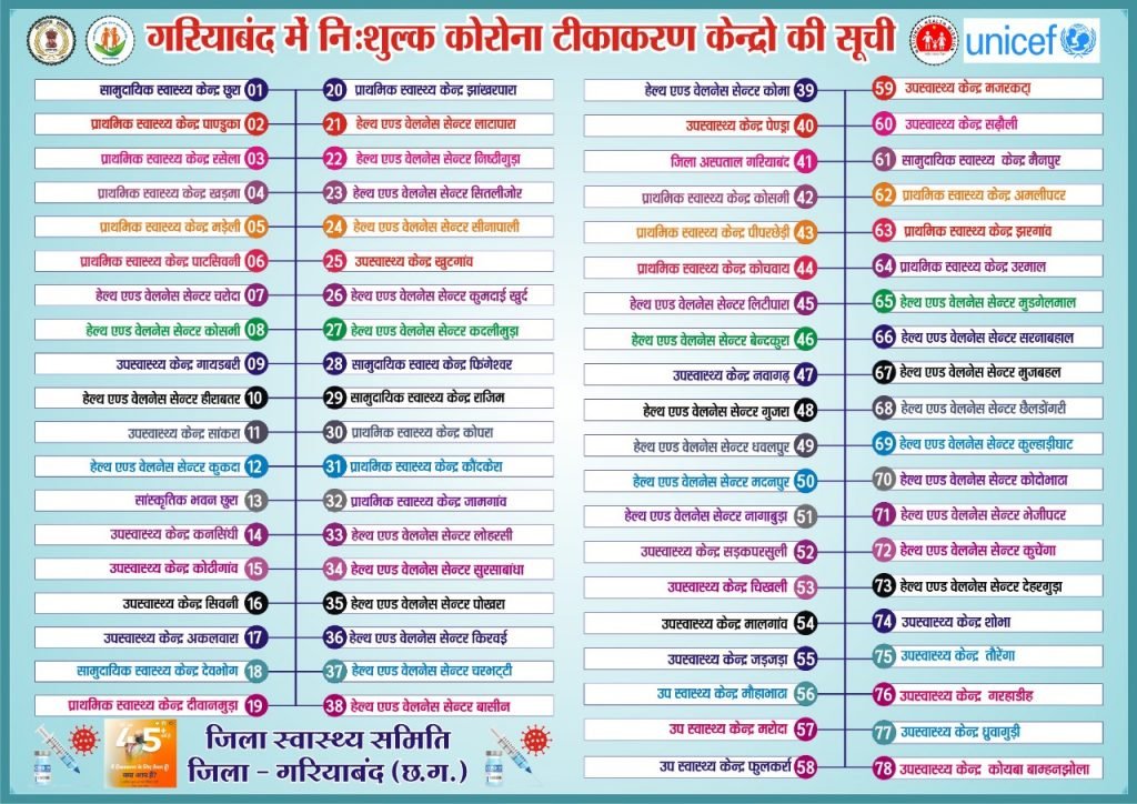 कलेक्टर निलेश कुमार क्षीरसागर एवं जिला पंचायत सी.ई.ओ के मार्गदर्शन व शासन के दिशा निर्देशों के अनुरूप कोविड 19 के प्रभाव को कम व खत्म करने के उद्देश्य व कोविड 19 टीकाकरण कवरेज बढ़ाये जाने हेतु 75 टीकाकरण सत्रों का संचालन किया जा रहा हैं जिसमें सामुदायिक स्वास्थ्य केन्द्र संचालित, प्राथमिक स्वास्थ्य केन्द्र, उप स्वास्थ्य केन्द्र, व हेल्थ एण्ड वेलनेस सेंटर सम्मिलित है। जिले में अब तक हेल्थ केयर वर्करों (स्वास्थ्य एवं महिला बाल विकास विभाग) को-5860 प्रथम डोज, 4828 द्वितीय डोज, फन्ट लाईन वर्करों (राजस्व विभाग, पंचायत विभाग, गृह विभाग, पुलिस विभाग) 3078 प्रथम डोज, 2091 द्वितीय डोज व सिटीजन 45 से अधिक आयु से जिसमें 60 वर्ष के बुजुर्ग भी सम्मिलित है 78430 हितग्राही को प्रथम डोज,1539 को द्वितीय डोज की वैक्सीन लगाया जा चुका है, जिले में कुल 87 हजार 365 हितग्राहियों को कोविड 19 की वैक्सीन से टीकाकृत किया जा चुका है।