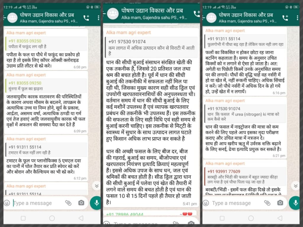रिलायंस फाउंडेशन से विषय विशेषज्ञ ने साग सब्जी में होने वाले बीमारी, कीट व पोषक तत्वों के बारे में जानकारी दी, साथ ही समूह के सदस्यों के द्वारा सक्रिय रूप से प्रश्न व्हाट्सएप के माध्यम पूछे गए जिसका एक एक करके व्हाट्सएप में जवाब दिया गया।