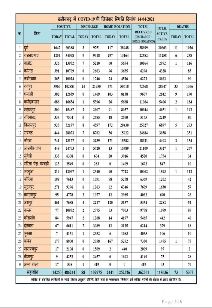 छत्तीसगढ़ में बुधवार को 14250 नए कोरोना संक्रमित मरीज मिले। स्वास्थ्य विभाग द्वारा जारी मेडिकल बुलेटिन के अनुसार बीते 24 घंटे में 2529 मरीज स्वस्थ हुए हैं। वहीं दूसरी ओर 73 मरीजों की उपचार के दौरान मौत हो गई। प्रदेश में अब तक 5307 कोरोना संक्रमित मरीज की मौत हो चुकी है।