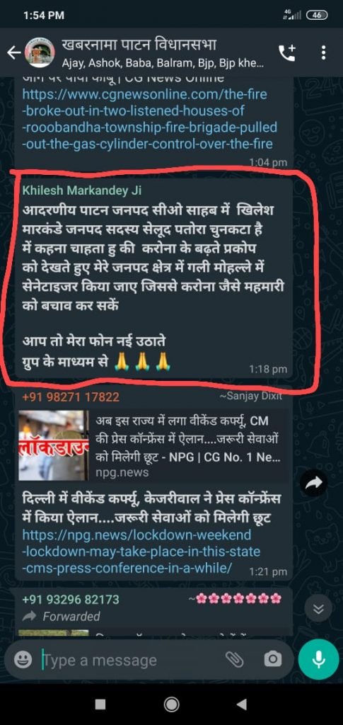 पाटन विधानसभा में अफसरशाही हावी है, यह इस बात का प्रतीक है कि एक जनप्रतिनिधि जनहित की बात समाचार व्हाट्सएप ग्रुप के माध्यम से सार्वजनिक रूप से अपनी बात सीईओ तक पहुंचा रहे है।