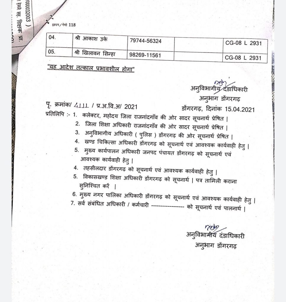 राजनादगांव। जिन शिक्षकों की ड्यूटी अभी तक जनगणना में लगाई जाती थी उनका कोरोना में अब टीकाकरण ,क्वॉरेंटाइन सेंटर, कोवीड सेंटर के साथ अब उनकी ड्यूटी शवो को मुक्तिधाम तक पहुंचाने में लगाई जा रही है। इस तरह का पहला आदेश राजनांदगांव जिले के डोंगरगढ़ से जारी हुआ है। SDM कार्यालय से जारी आदेश के मुताबिक रोटेशन पालिसी के तहत शिक्षकों की ड्यूटी लगाई गई है। जो कोविड सेंटर में मृत मरीजों को श्मशान घाट तक पहुंचवाने का काम करेंगे और परिजनों के साथ कॉर्डिनेट करेंगे। वो कंट्रोल रूम से पूरा कॉर्डिनेशन का काम करेंगे।